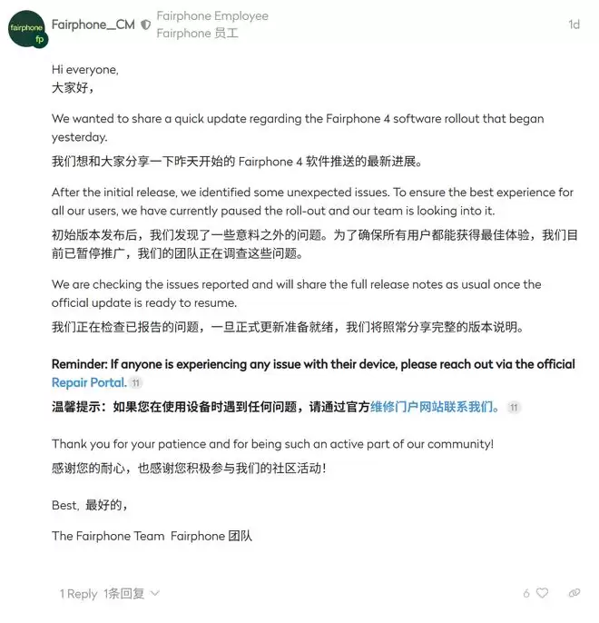 面对涌现的故障报告,Fairphone迅速做出了反应。其在社区发布公告,确认在初始发布后发现了“意外问题”。