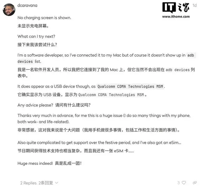 另一位用户hamletdothrock也遭遇了同样困境,他补充说:“我的情况一模一样,手机现在就是一块砖头,插上充电器也毫无反应,甚至无法尝试强制重启。”