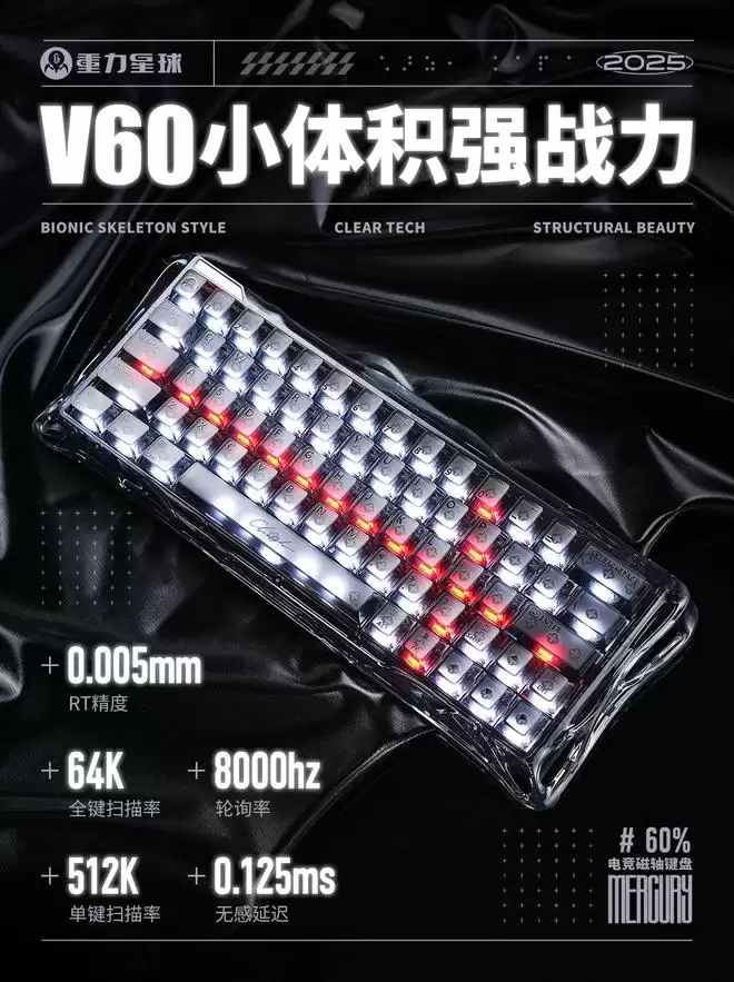 IT之家12月25日消息,重力星球昨晚正式发布了V60夜隐磁轴键盘。这款键盘采用面向电竞玩家的无Fn区60%配列,支持有线单模连接,轮询率8kHz,全键扫描率64kHz、单键扫描率512kHz。
