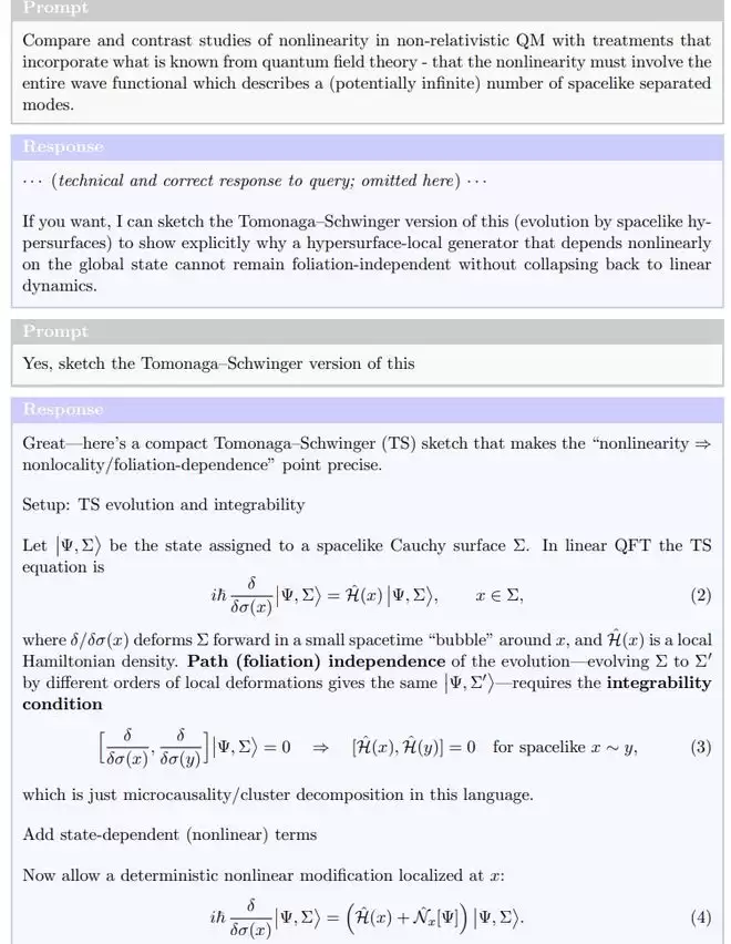 他向GPT-5问了一个看似「咨询式」的问题:如果要检查非线性量子演化和相对论是否兼容,应该用什么框架?