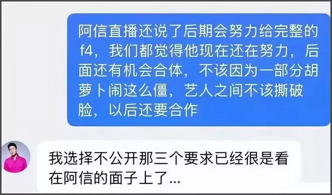 此前曾有粉丝私信朱孝天不要闹太僵,艺人之间不该撕破脸,以后还要合作,但朱孝天明显是不想再忍受粉丝无端指责了,称自己不公开那三个“昧良心”的要求,已经是看在阿信的面子上了。