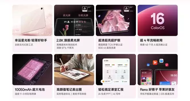 系统方面,OPPO Pad Air 5搭载了全新的ColorOS 16系列。在生态互联功能上,它支持手机5G网络平板秒共享、iPhone极速互传、运动相机互联以及安卓设备互传等功能。