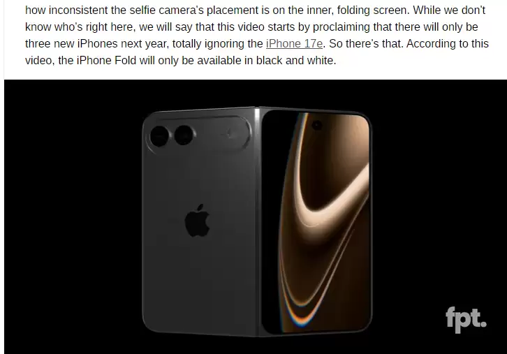 视频中,iPhone Fold的折叠内屏前置摄像头位置,与此前曝光的CAD设计图存在明显差异,成为争议焦点之一。更值得关注的是,视频宣称苹果明年仅推出三款新iPhone,完全忽略了业内普遍预期的iPhone 17e机型,进一步降低了其可信度。此外,视频透露该机型将仅提供黑、白两种配色,这一信息也尚未得到任何权威爆料佐证。