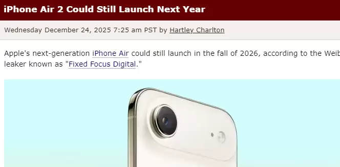 【环球网科技综合报道】12月25日,据macrumors报道,苹果第二代iPhone Air仍有望按原定计划,于2026年秋季正式推出。