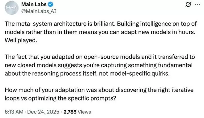 对于这个 meta-system,有人认为「太棒了。在模型之上构建智能,而不是在模型内部构建,意味着可以在几个小时内适配新模型,非常高明。适配开源模型,并且成功迁移到新的封闭模型,这表明捕捉到的东西是推理过程本身的基本规律,而不是模型特定的怪癖。」