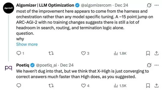 对于这个问题,Poetiq 肯定了「X-High 只是比 High 更快地收敛到正确的答案」这一观点。
