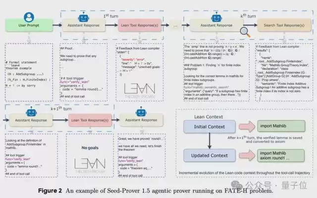 Mathlib搜索工具:类似于程序员查阅技术文档,模型可以主动检索Lean庞大的数学库 Mathlib,寻找可用的定理和定义,而非依赖不可靠的隐式记忆。Python代码执行:遇到需要计算的部分,模型可以编写并运行Python脚本来辅助验证直觉。增量式引理验证:模型不再被迫一次性生成整个证明,而是将复杂问题拆解为若干引理。每证明出一个引理,系统就会将其保留并复用,作为后续推理的基石。