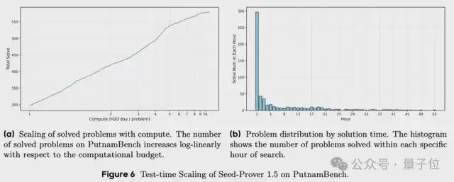 如上图所示,投入更多的计算资源,Seed Prover 1.5对问题的解决率会呈对数线性增长。