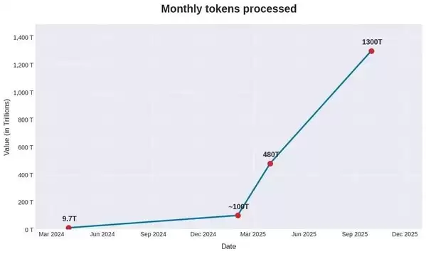 来自多方的数据也有力佐证了token消耗量的指数级增长趋势。火山引擎最新披露的数据显示,截至今年12月,字节跳动旗下豆包大模型日均token使用量突破50万亿,较去年同期增长超过10倍,相比2024年5月刚推出时的日均调用量增长达417倍;谷歌在10月披露,其各平台每月处理的token用量已达1300万亿,相当于日均43.3万亿,而一年前月均仅为9.7万亿。