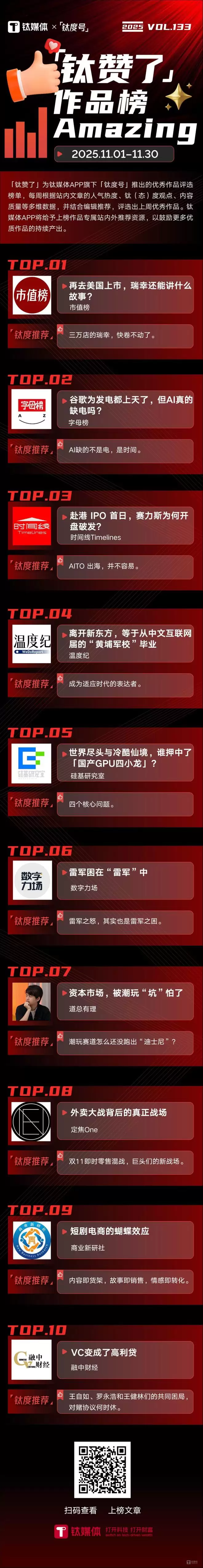 2025年11月1日至2025年11月30日,「钛赞了」榜单第133期上榜作品如下: