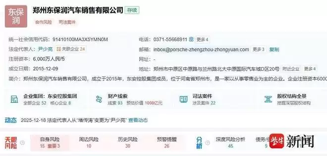 根据天眼查工商信息,该公司在12月17日,曾发生高管变动。原执行董事兼总经理堵传涛退出,尹少亮接任董事及经理职务,但仅任职两天便卸任。资料显示,郑州东保润汽车销售有限公司则隶属于东安控股集团有限公司,该集团总部位于河南新乡,旗下拥有40余家子公司,业务覆盖保时捷、宝马、奥迪等豪华品牌。