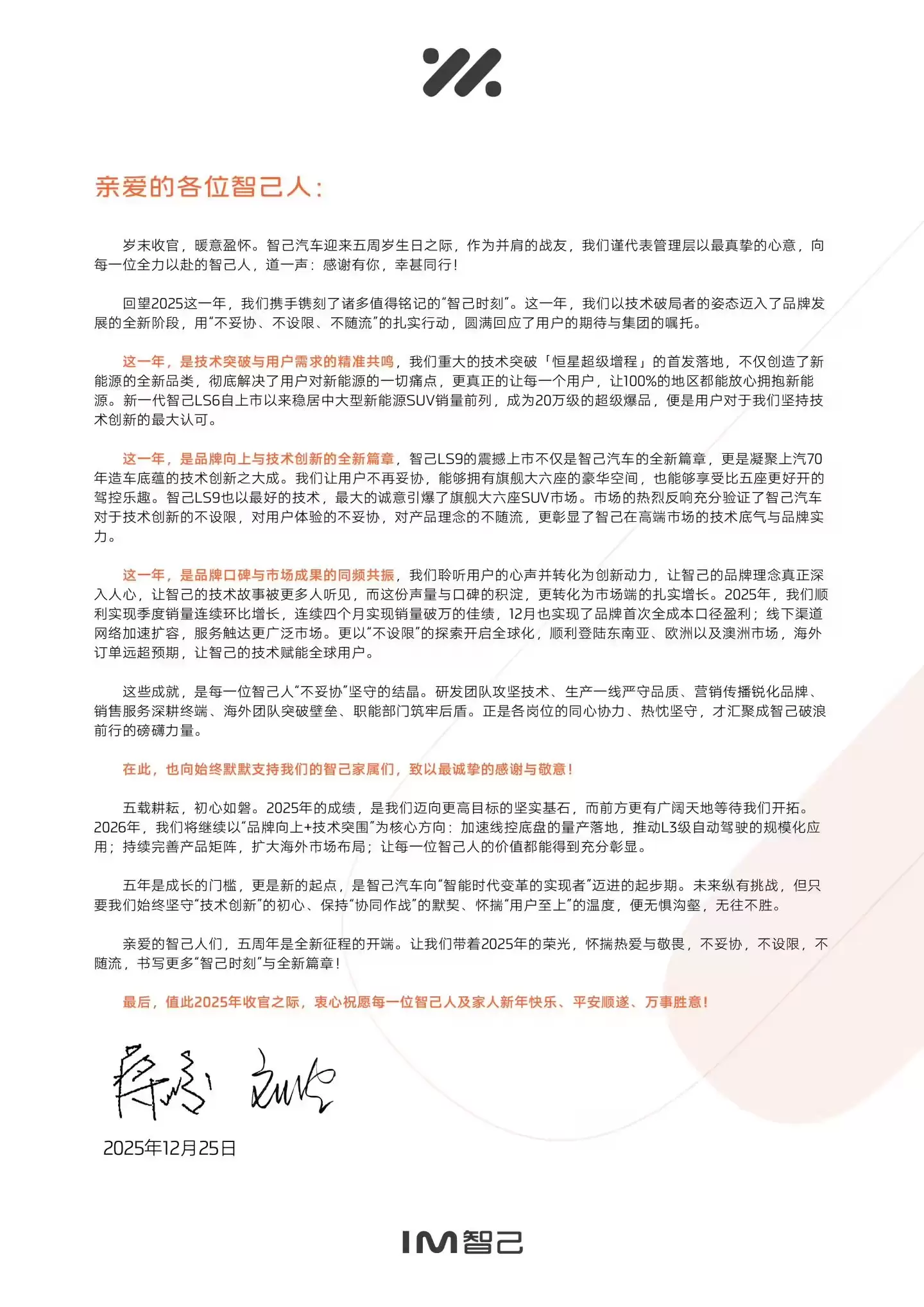 12月25日,智己汽车迎来成立五周年的重要时刻。公司最新发布了一封致全体员工的内部信,信中系统回顾了2025年取得的丰硕成果,并清晰展望了2026年的战略规划。