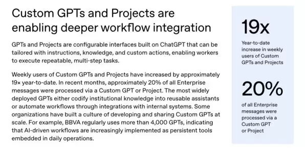 ▲OpenAI在2025年12月8日的最新报告显示,自年初以来,ChatGPT定制服务的用户数量增长了约19倍,企业约20%的消息通过ChatGPT定制服务处理。(来源:OpenAI正式)