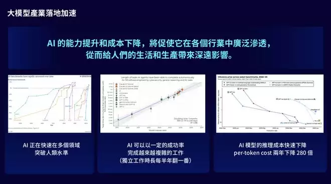 在大规模商业化落地过程中,AI仍面临许多挑战。比如可靠性不足,尤其专业思维数据依旧非常稀缺;空间智能、多模态理解存在短板;成本虽已经经过上百倍的下降,但模型处理复杂任务时,需要很长的过程和反复试错,规模化应用时,成本依然非常高昂。