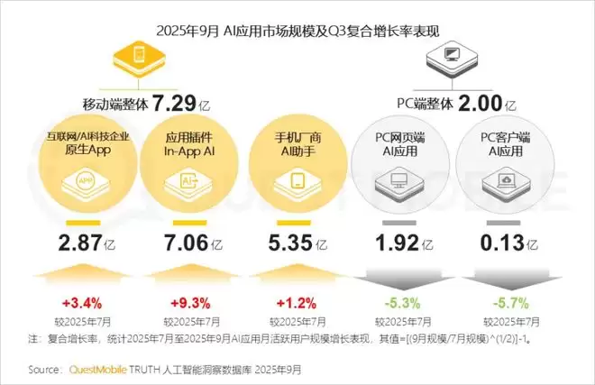 QuestMobile的数据显示,截至2025年9月,AI市场进入白热化的快速迭代阶段,技术追求从“大而全”转向“精而强”,在成本可控范围内实现性能提升;AI应用市场移动端、PC端月活跃用户数分别达到7.29亿、2.00亿,其中豆包超过DeepSeek,两者月活跃用户规模分别为1.72亿、1.45亿。