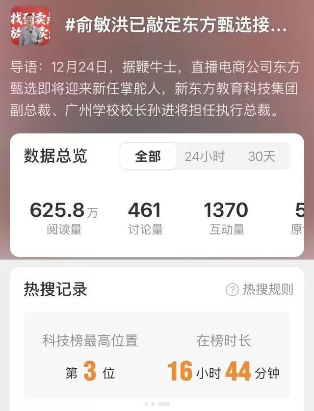 12月24日,有媒体报道称,俞敏洪已为东方甄选选定了新的接班人,新东方教育科技集团副总裁、广州学校校长孙进将担任东方甄选执行总裁,随后“俞敏洪已敲定东方甄选接班人”话题登上微博热搜榜。