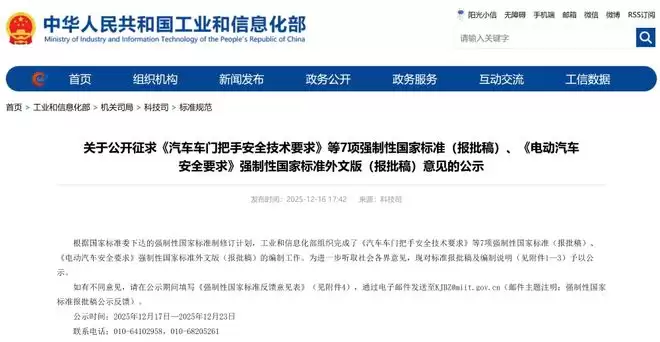 12月18日,工业和信息化部正式发布关于公开征求《汽车车门把手安全技术要求》等7项强制性国家标准(报批稿)、《电动汽车安全要求》强制性国家标准外文版(报批稿)意见的公示。