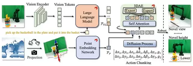 GeoVLA 是一个全新的端到端框架,其流程包含三个关键组件的协同工作: