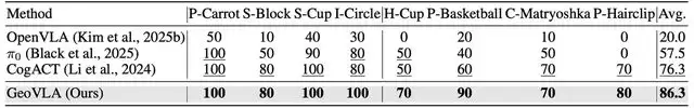 作者团队使用 WidowX-250s 机械臂进行了广泛的真机测试;实验被分为“基础任务”和“3D 感知任务”。在域内任务中,GeoVLA 在基础任务上平均成功率 95.0%,在 3D 感知任务上为 77.5%,总体平均 86.3%,大幅领先 Pi0 (57.5%) 和 CogACT (76.3%)。特别是在 Put Basketball 和 Put Hairclip 等需要精确空间理解的任务中,GeoVLA 表现出更好的鲁棒性。