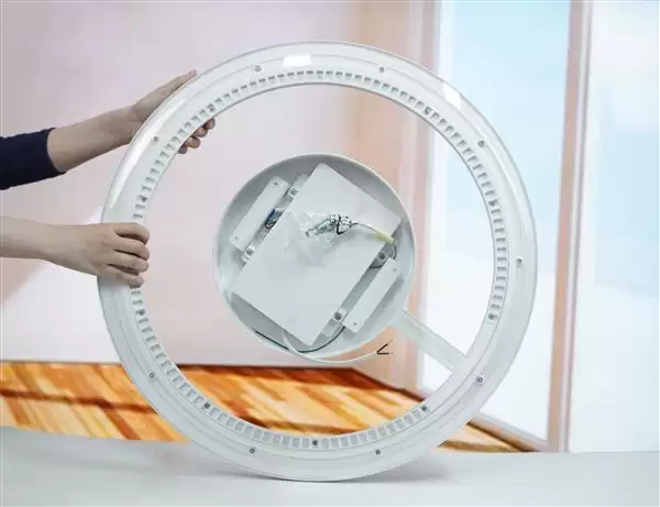 米家漫反射吸顶灯高度仅20cm,圆环造型不压层高,机身净重约4kg。其主打广角漫反射布光与专业级护眼能力,采用创新的170°超大角度导光技术,搭载上下双光源设计。