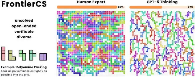 想象一下,你要把一堆形状各异的俄罗斯方块(学名叫多连块,Polyomino)尽可能紧密地塞进一个矩形网格里。最紧密的摆法是什么?没人知道。但给定任意一种摆法,我们可以精确计算出它的密度(占据面积除以总面积)。人类专家在这道题上能达到 87% 的密度,而 GPT-5 Thinking 只做到 47%。两种摆法都未必是最优解,但密度这个连续指标能直观地反映出相对表现:谁的解法更好,一眼就能看出来。
