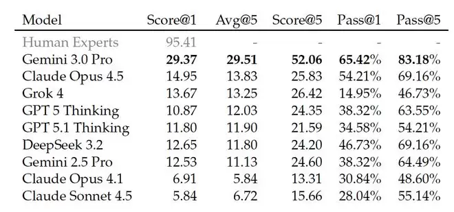 在算法赛道上,人类专家的平均得分是 95.41 分,而表现最好的 Gemini 3.0 Pro 只拿到 29.37 分。GPT-5 Thinking、Claude Opus 4.5、DeepSeek V3.2 Thinking 等当红模型的得分都在 10 到 15 分之间徘徊。