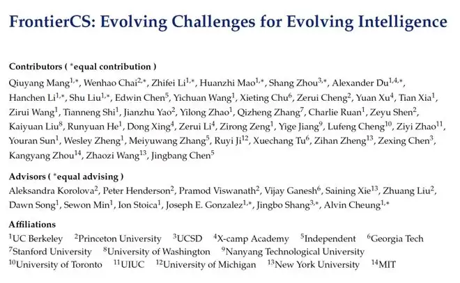 为了解决这个问题,半年后,一支汇聚了加州大学伯克利分校、普林斯顿、加州大学圣地亚哥分校等多所顶尖高校成员的联合团队,共同推出了 FrontierCS。