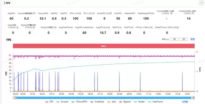 在我们的原神测试中也保持了这样的性能表现,最高画质模式下,平均帧数达到60FPS,稳帧指数0.2,1%LOW帧有52.1FPS。