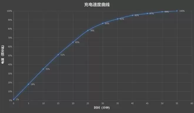 最终充电速度如图所示,5分钟充入18%,10分钟充入35%,20分钟充入65%,半小时充入86%,55分钟充满100%。
