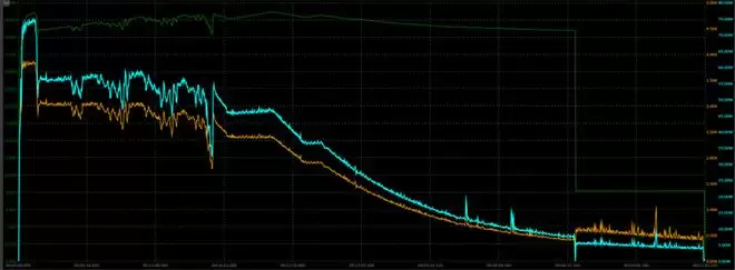 在17分钟降低到45W的水平,持续3分钟后开始降低到35W,简单维持了1分钟后就进行了持续性的降流,一直到45分钟,充电电压降低为5V,开始最后的涓流充电。