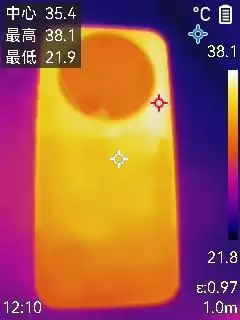 最高温度也只有38.1度,从图中我们就能看出来这款机型的散热表现能力,热量分布得非常均匀。