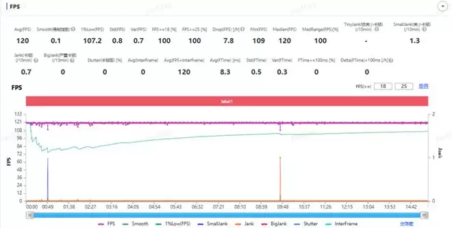 在《王者荣耀》120帧数极致画质模式下,平均帧不多不少正正好好120FPS,稳帧指数0.1,1%low帧也达到了107.2FPS