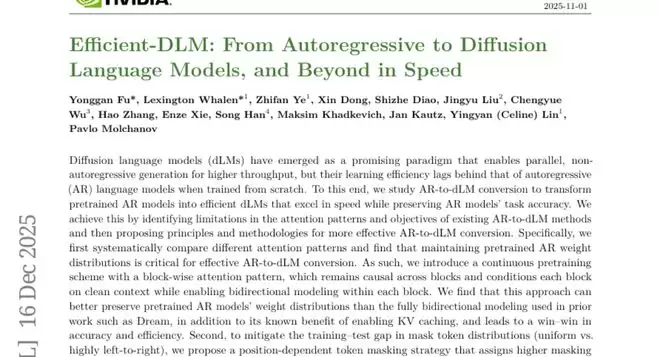 A:Efficient-DLM最大的优势是能够并行生成多个词汇,而不是像传统模型那样一个词一个词地顺序生成。这使得它在保持相同准确性的情况下,速度可以提升2-5倍。同时,它还保持了"一模多用"的灵活性,可以根据需要在速度和准确性之间自由切换。