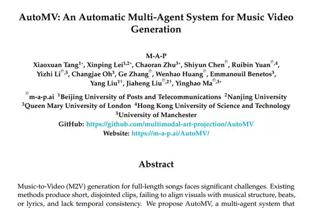 这项由M-A-P研究组织联合北京邮电大学、南京大学、伦敦玛丽女王大学等多所院校开展的突破性研究发表于2025年12月,研究团队开发出名为AutoMV的自动音乐视频生成系统,论文编号为arXiv:2512.12196v1。领导这项研究的包括来自北京邮电大学的唐小轩、雷新平,伦敦玛丽女王大学的朱超然、马映昊等多位研究者,他们在音乐视频自动生成领域取得了前所未有的进展。