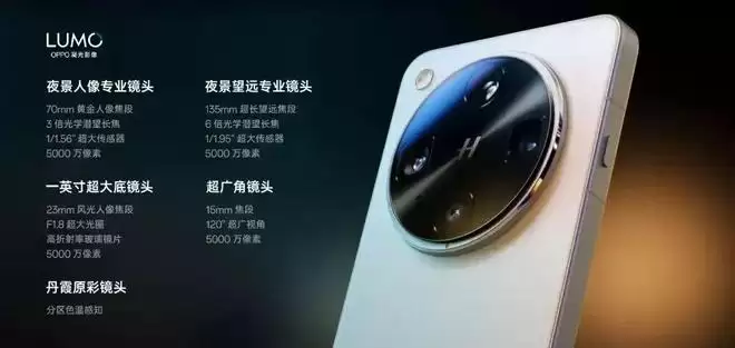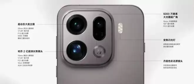 不久前发布的OPPO Find X9 Pro配备了5000 万像素广角摄像头、5000 万像素超广角摄像头、2亿像素长焦摄像头、丹霞色彩还原镜头组合。