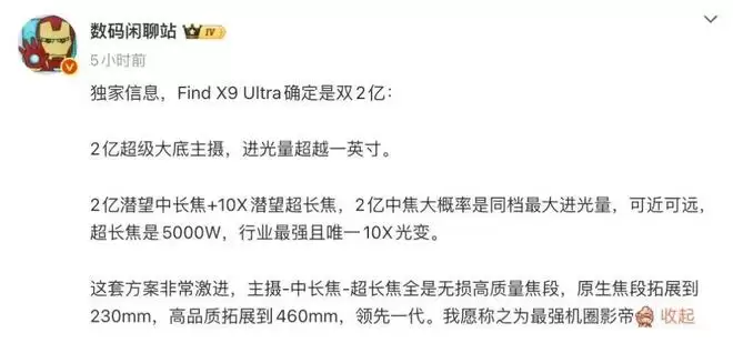 OPPO Find X9 Ultra确定是双2亿: