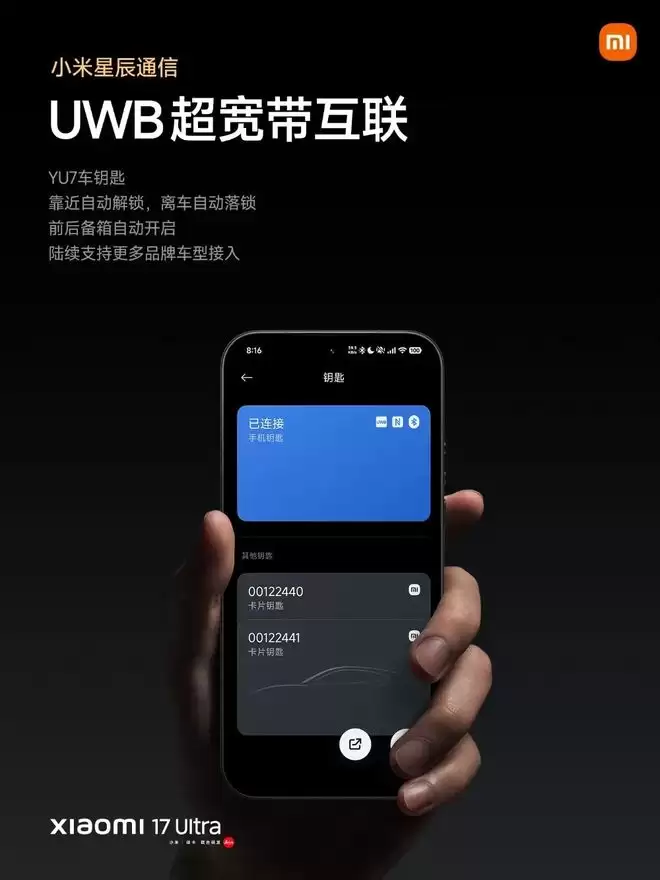 还有小米星辰通信系统,搭载高性能天线组和5颗信号增强芯片,支持51个4G+5G 频段。UWB超宽带互联技术,小米YU7车钥匙,实现靠近自动解锁、开启前后备箱、离车自动落锁。