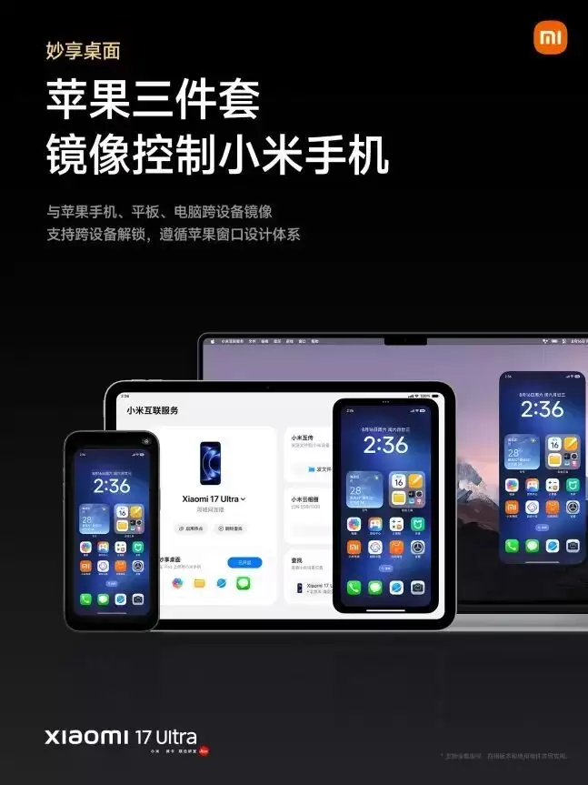 支持在iPhone上实现小米手机完整投屏操控,可镜像点外卖、乘车码等;小米首次苹果三件套妙享桌面,跨设备镜像、解锁。