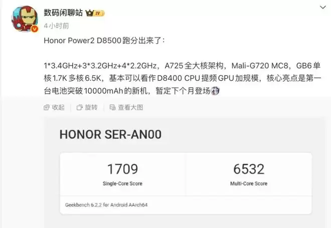 今天,博主@数码闲聊站 的一份爆料中显示了这款新机的跑分信息。结合来看,这款新机型号为 SER-AN00,单核跑分成绩 1709、多核跑分成绩 6532。