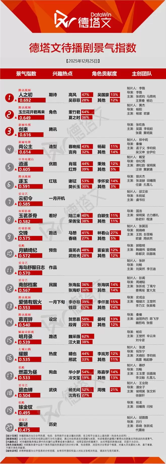 悬疑剧《人之初》于近期密集发布主题曲MV及剧情切片,且市场盛传其将于12月27日空降跨年档,带动景气指数攀升至榜单前列。该剧主创阵容强大,因而备播期持续吸睛,剧情主打“双时空+悬疑情感”。观察当前舆情,虽然物料中呈现的电影级质感被赞“细糠”,但部分受众担忧预告片剪辑“故弄玄虚”,且因涉及犯罪尺度,市场对过审删减及能否如期定档存在焦虑。该剧能否在保证悬疑强度的同时实现情感共鸣,并在审查红线与剧情深度间找到平衡,将是其能否获得超预期成绩的关键。《人之初》由李路执导,张若昀、马思纯主演,腾讯视频、艺达影视、弘道影业等出品。
