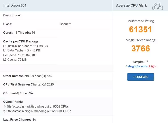 12月26日,据IT之家消息,科技媒体Wccftech于12月25日发布博文披露,在英特尔即将推出的Granite Rapids-WS工作站处理器系列中,入门型号Xeon 654已现身PassMark跑分数据库。