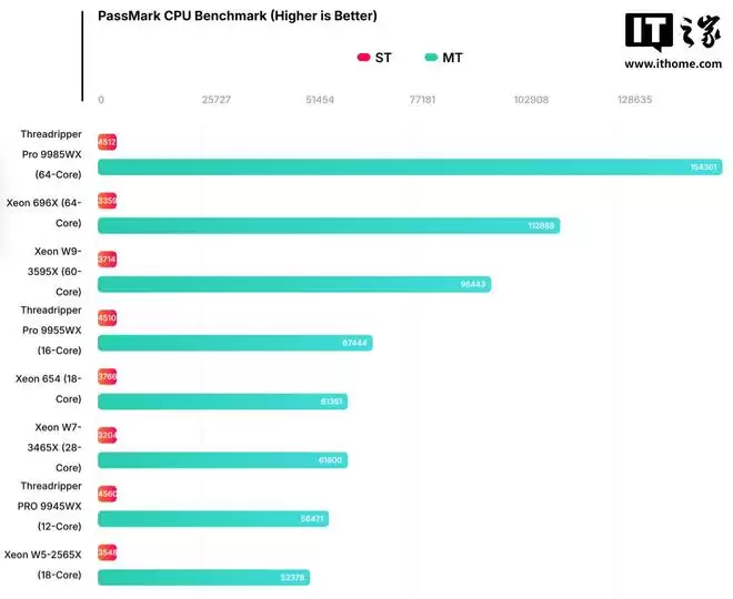 然而,当我们将目光转向竞争对手AMD时,形势则显得严峻。测试表明,Xeon 654在单线程和多线程性能上均落后于AMD的Threadripper 9955WX。值得注意的是,AMD这款竞品仅配备了16个核心,却凭借更为先进的Zen 5架构实现了性能反超。IT之家附上原文跑分对比截图如下: