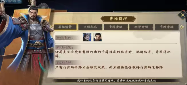 不同的羁绊在实战中效果各异,这里先看看几组实用性突出的搭配。例如曹操和诸葛亮拥有的“草船借箭”战术技能:诸葛亮在第一次受到曹操手牌伤害时,可以抵消该伤害,同时将这张牌收为己用。再比如当“剑雨骑射”技能发动攻击时,诸葛亮可以直接触发羁绊,把这张群体攻击牌收入囊中,等待第二次使用的时机。曹操和关羽的“义释华容”则偏向于辅助联动,关羽在开局时可以直接装备“司马兔”,回合开始后便能多摸一张牌。