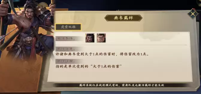 在生存向的羁绊中,典韦以及许褚的羁绊也值得关注。这一对组合的效果是:当受到单次大于一点的伤害时,伤害值会自动降为一点。面对赵高这类高爆发的首领时,它能显著提升队伍的容错率,再也不必担心被瞬间秒杀。还有张飞相关的“桃园结义”羁绊,不仅可以让羁绊武将的体力值上升,更关键的是还能回复所有成员的体力。即便是重伤救援回复体力时,同样可以触发效果。因此用刘备搭配张飞、关羽,能实现持续的回复,整个队伍的续航能力都将得到保障。