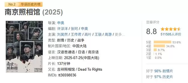 昨天还在吐槽今年华语电影整体表现糟糕,豆瓣竟然连10部优秀的华语片都选不出来,还搞出两个空缺。但申奥的《南京照相馆》却是8.8分的豆瓣高分,稳居2025年华语片豆瓣评分第一名。