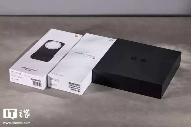 小米 17 Ultra 徕卡版采用了黑色的方形包装,包装内部除了手机本体之外,还有徕卡版独有的素皮保护壳,不仅有红色的徕卡标,包括保护壳镜头部分的金属圈,也是可以转动的。