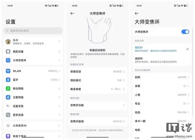 系统内有大师变焦环的独立设置选项,可以自定义各种拍摄功能;另外,IT之家体验中发现,单手握持时,食指刚好抵在摄像头变焦环区域,容易存在误触的情况,好在并不太影响体验。