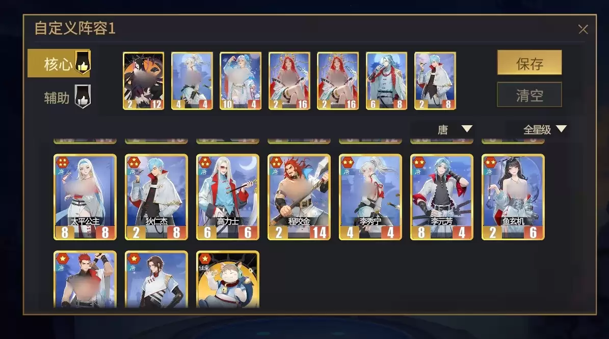 唐阵营中的李秀宁、杨玉环能与玄武形成极佳的搭配,同时她们也都是遗计唐流派的核心。在使用时可将这两名部将摆在前置位,快速令她们阵亡配合玄武的特性来召出大量的禁军,还能触发武则天的鼓舞为全部的唐阵营部将提升数值。此阵容的特点时前期可利用多名禁军来帮助自己进行攻击,为武则天留足发育时间,待她的属性全面增高后,便可接过输出重任带队作战。搭配时,可上李秀宁、杨玉环、玄武、武则天(两位)、长孙无忌、狄仁杰。