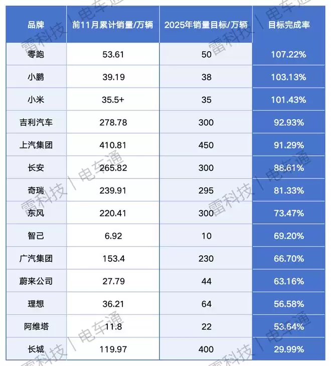 文章开始,先跟大家分享一组数据。制表:电车通电车通整理了以上主流车企前11月销量及今年销量目标的情况,其中零跑、小鹏、小米三家新势力,已于11月底率先达标。小米、零跑提前冲线并不意外,毕竟这两家新势