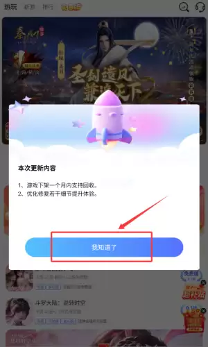 2、仔细查看更新公告的内容,然后点击红框注明的“我知道了”按钮进行确认。